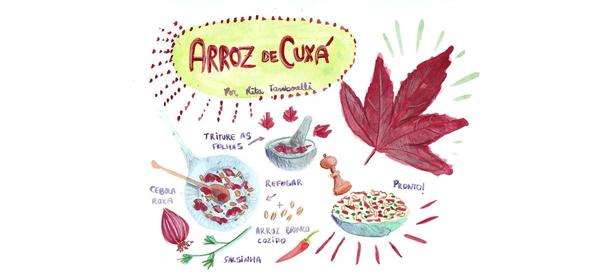 No Maranhão tem um prato muito típico chamado arroz com cuxá ou arroz de cuxá, e eu vou te contar a minha versão dele. Tradicionalmente preparado com camarão seco, aqui vou omitir este ingrediente e ainda assim ficará muito saboroso. Gosto de moer as folhas no pilão de pedra, mas na falta de um você pode “machucar” as folhas com as costas da faca ou com uma colher de pau. Este prato pode ser feito com a folha verde ou roxa, mas particularmente gosto muito do aspecto que dá a vinagreira roxa, e inclusive acabo usando também a cebola roxa para ajudar na coloração do arroz. A planta o deixa com um sabor bem azedinho. Também agrega uma boa umidade ao preparo: como a vinagreira é parente do quiabo, ela também solta um pouco de baba, bem pouco na verdade, mas o suficiente para somar mais viscosidade, fica uma delícia!