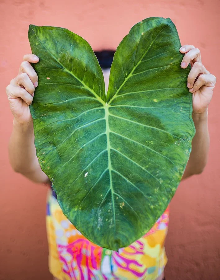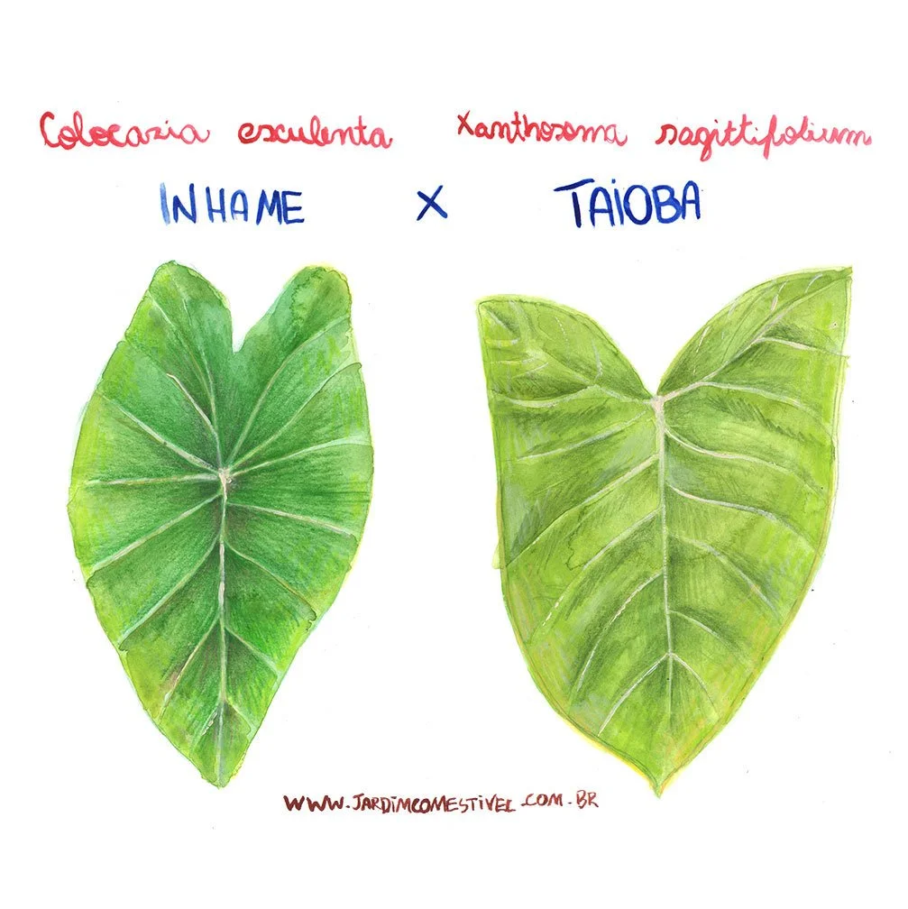 Tanto a taioba (Xanthosoma sagittifolium) quanto o inhame* (Colocasia esculenta) são plantas da família botânica Araceae - a mesma dos antúrios, costela-de-adão, entre muitas outras. A taioba é nativa das Américas e todas as partes da planta podem ser consumidas: folha, pecíolo (talo) e o cormo. Já do inhame, nativo do sudeste asiático, apenas o cormo é adequado para o consumo, e é por isso que a identificação correta dessas plantas é tão importante, pois, por serem parentes próximas, são muito similares morfologicamente. Ambas têm folhas sagitadas (em forma de flecha) ou formato que lembra um coração “pontiagudo”, mas diferem no local de inserção do pecíolo. Na taioba, o pecíolo está exatamente onde os “lobos” da folha se encontram. Já no inhame, o pecíolo está inserido abaixo da região de encontro dos “lobos”. Essa característica pode variar ligeiramente em algumas plantas, e observar a coloração pode ajudar a sanar a dúvida. A taioba tem tom verde uniforme, tanto nas folhas quanto no pecíolo, e as nervuras das folhas são levemente amareladas; no inhame, o pecíolo é escuro, em tonalidades de roxo intenso, que pode também aparecer nas folhas.